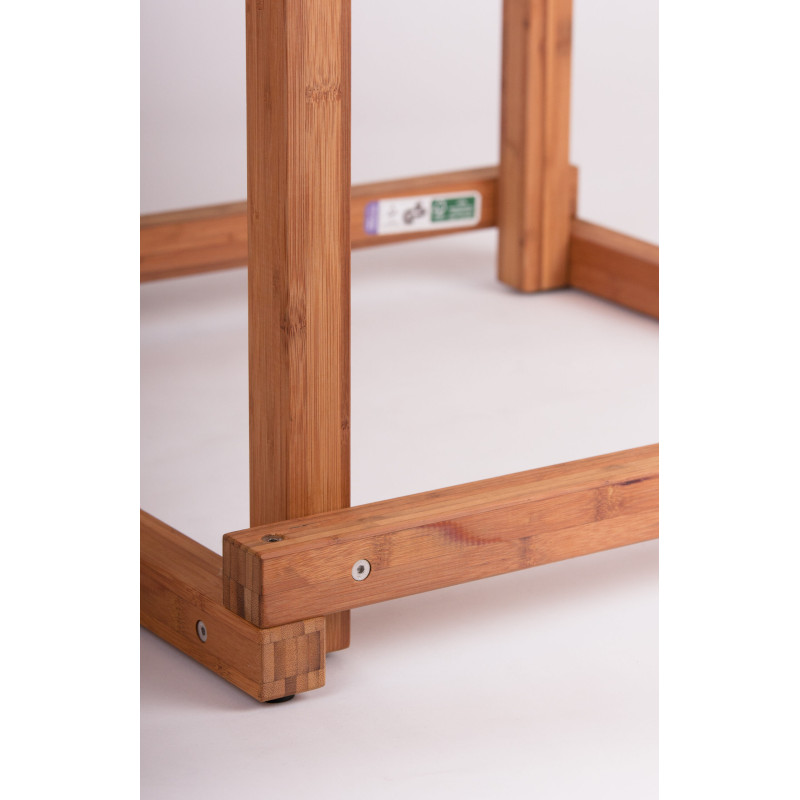 Поперечная планка стойки, изготовлена из бамбука — гладкая, прочная и погодоустойчивая поверхность которого, позволит оставлять гамак с малышом снаружи в летнюю пору. Бамбук обработан в условиях высокой температуры (карамелизация), поэтому, планка имеет контрастирующий с полотном темный световой оттенок.