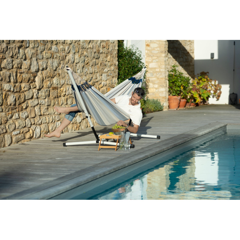 Стойка для двухместных гамаков изготовлена из прочной стали с порошковым покрытием, устойчивым к атмосферным воздействиям и поэтому идеально подходят для заднего двора, сада, патио или бассейна. Также сталь с порошковым покрытием прочна и простая в уходе.