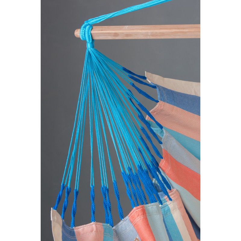 Благодаря большой площади пространства для лежания, в таком стуле вы можете не только сидеть, но и удобно лежать. К тому же, прочная бамбуковая планка удерживается достаточное широкое расстояние между краями сукна – таким образом на подвесном стуле могут удобно расположиться двое отдыхающих. Надежный механизм крепления, толстые канаты и уплотненные края сукна гарантируют Вам полную безопасность отдыха в модели Domingo.