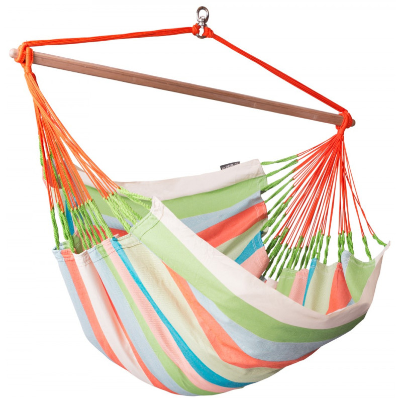 Разработанный и запатентованный фирмой La Siesta встроенный вертлюг обеспечивает дополнительный комфорт и безопасность. Он позволяет вращаться по оси. При этом шнуры для подвешивания не переплетаются.