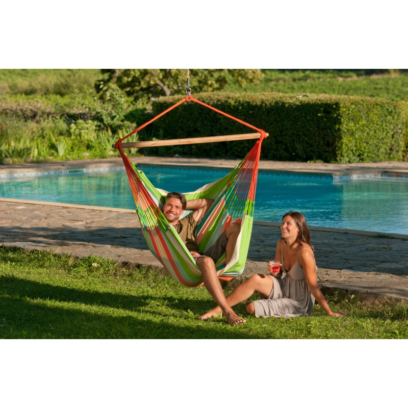 Благодаря большой площади пространства для лежания, в таком стуле вы можете не только сидеть, но и удобно лежать. К тому же, прочная бамбуковая планка удерживается достаточное широкое расстояние между краями сукна – таким образом на подвесном стуле могут удобно расположиться двое отдыхающих. Надежный механизм крепления, толстые канаты и уплотненные края сукна гарантируют Вам полную безопасность отдыха в модели Domingo.