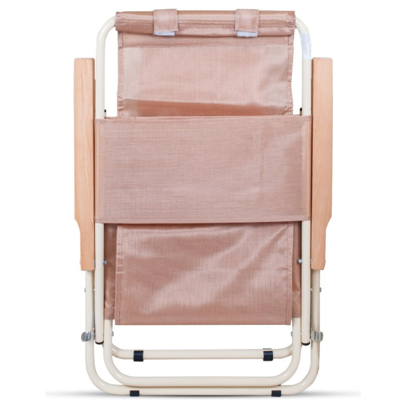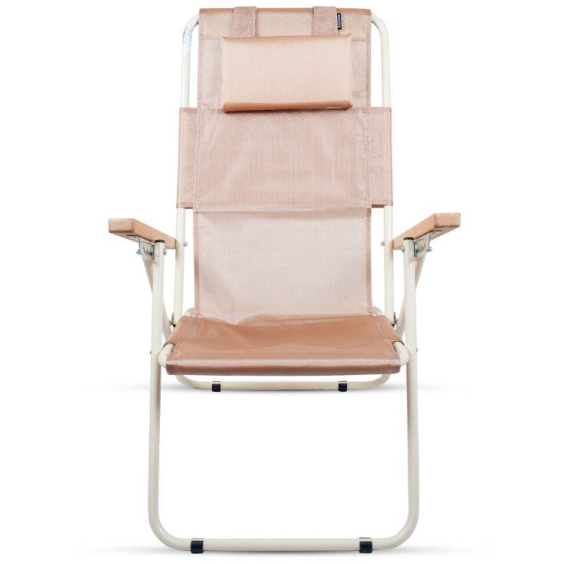 Розкладається шезлонг елементарно. Каркас надійний, сталева труба діаметром 22 мм і товщиною стінок 1 мм.всі сталеві частини мають полімерне покриття. Підлокітники дерев'яні, що дуже приємно і зручно. Має три положення нахилу спинки, які регулюються під підлокітниками. Тканина "сіточка" - вам не буде жарко в шезлонгу влітку на природі або в тінистому саду. У підголівнику на липучці розміщується знімна подушка.