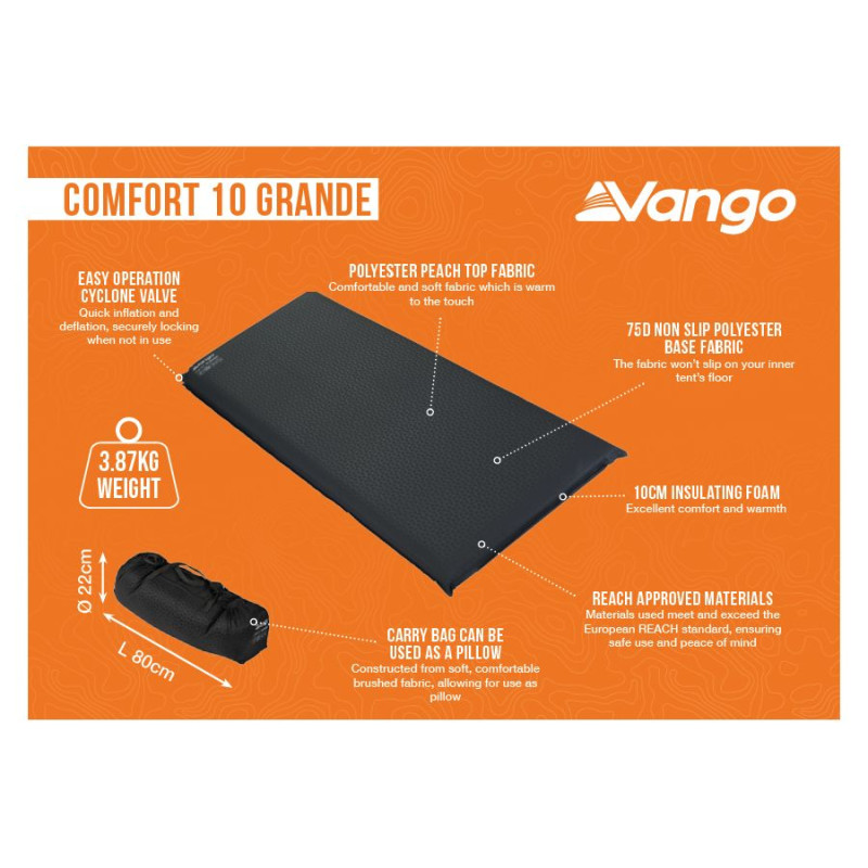 Vango Comfort 10 Grande Shadow Grey (SMQCOMFORS32M1O) - роскошный одноместный самонадувающийся коврик со стильным флокированным верхом и прочной нескользящей основой, отличается непревзойденным комфортом и удобством. С помощью клапана Cyclone Flip Valve надувание и спускание воздуха происходит намного быстрее и проще, чем при использовании традиционных клапанов. Просто откройте клапан и наблюдайте, как коврик расширяется. Предпочитаете более жесткий коврик Просто добавьте немного воздуха. После крепкого ночного сна большое отверстие клапана Cyclone Flip Valve способствует быстрому выходу вохдуха из коврика, что упрощает его упаковку.